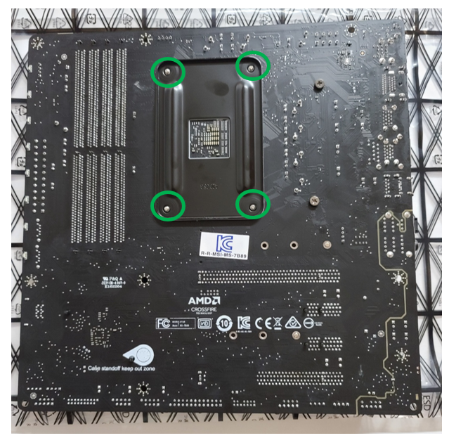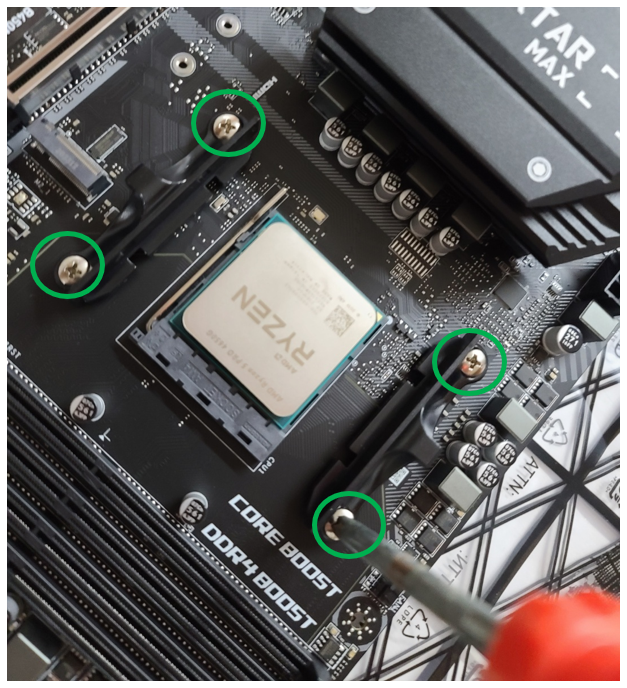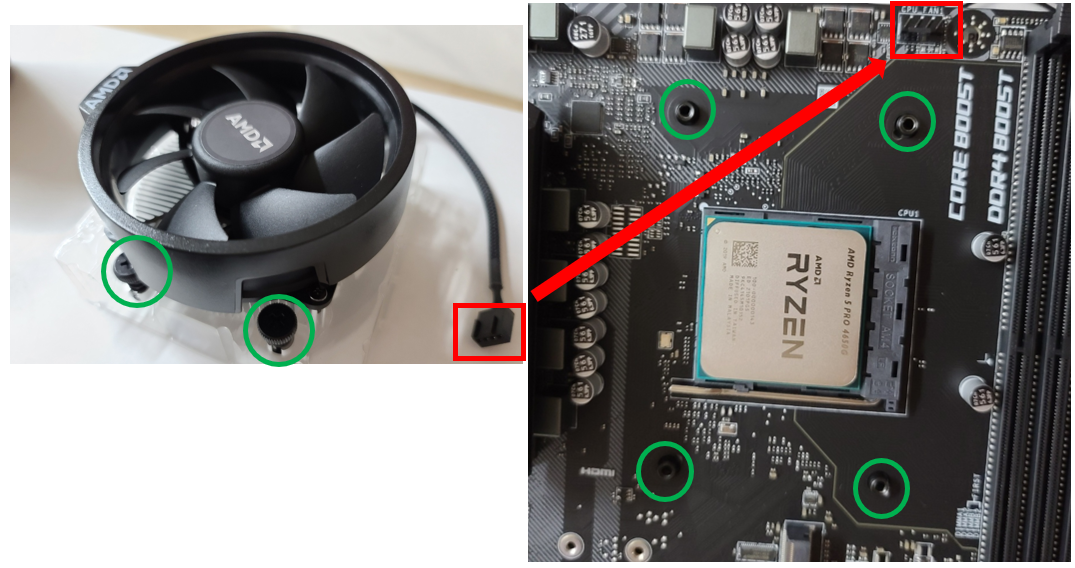쿨러를 저기 구멍 위치에 맞춰서 올려줄거예요. 그리고 쿨러에 다려있는 스프링나사를 네 모서리에 맞춰서 조이면 됩니다.