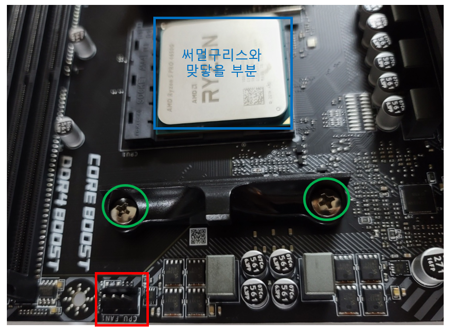 CPU은색 부분에 써멀구리즈가 묻을 수 있도록 위치시킬거예요.