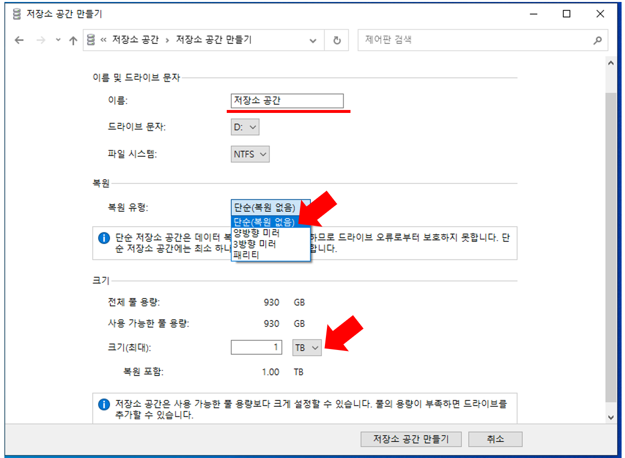 이름: 원하시는 이름으로 변경해주세요. 저렇게 기본으로 설정할 경우 탐색기에서 '저장소 공간 (D:)'의 이름으로 할당됩니다.