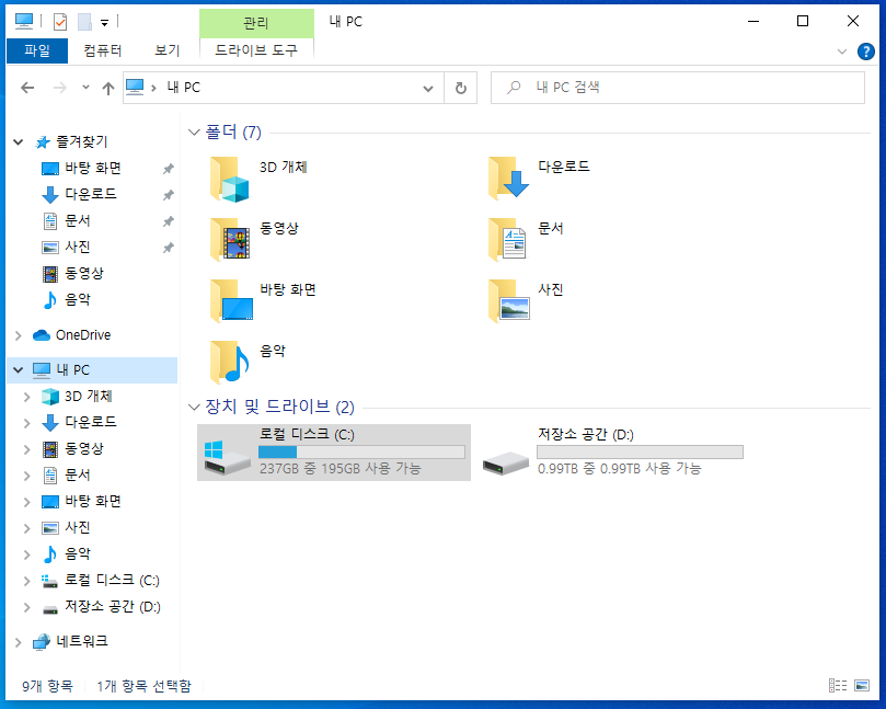 탐색기 내 PC부분을 가서 확인해봅시다. 사라졌었던 D드라이브가 뙇! 생긴 것을 확인할 수 있어요.