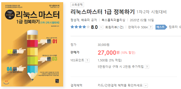 '리눅스마스터 1급 2차 실기 정복하기' 책 또한 같은 저자로써 내용이 진짜 개똑같아요 그니까 이왕이면 노랭이책 한권만 사시는걸 추천. 이번에 이기적에서 1급 대비 책이 나왔던데 그 책은 못봤네...